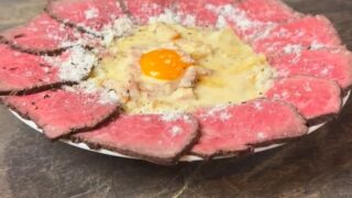 卵黄の下には、一枚麺とゆう帯上のパスタが折りたたんで入っており、麺を持ち上げるときのインパクトはすごいです!味はカルボナーラで、周りのローストされたサーロイン肉と絡めて食べる至極の幸せを是非ご堪能くださいませ。