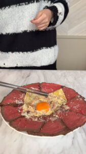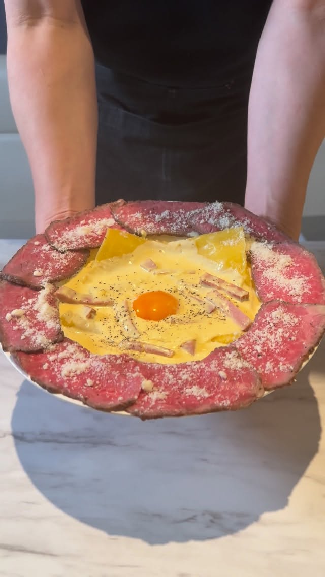 卵黄の下には、一枚麺とゆう帯上のパスタが折りたたんで入っており、麺を持ち上げるときのインパクトはすごいです!味はカルボナーラで、周りのローストされたサーロイン肉と絡めて食べる至極の幸せを是非ご堪能くださいませ。
