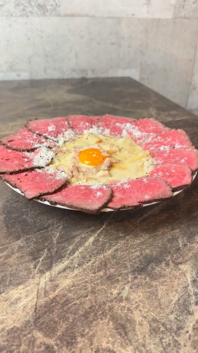 卵黄の下には、一枚麺とゆう帯上のパスタが折りたたんで入っており、麺を持ち上げるときのインパクトはすごいです!味はカルボナーラで、周りのローストされたサーロイン肉と絡めて食べる至極の幸せを是非ご堪能くださいませ。