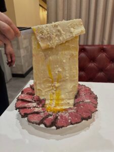 卵黄の下には、一枚麺とゆう帯上のパスタが折りたたんで入っており、麺を持ち上げるときのインパクトはすごいです!味はカルボナーラで、周りのローストされたサーロイン肉と絡めて食べる至極の幸せを是非ご堪能くださいませ。