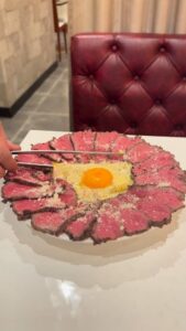 卵黄の下には、一枚麺とゆう帯上のパスタが折りたたんで入っており、麺を持ち上げるときのインパクトはすごいです!味はカルボナーラで、周りのローストされたサーロイン肉と絡めて食べる至極の幸せを是非ご堪能くださいませ。
