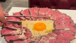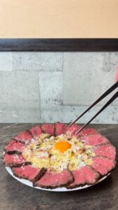 卵黄の下には、一枚麺とゆう帯上のパスタが折りたたんで入っており、麺を持ち上げるときのインパクトはすごいです!味はカルボナーラで、周りのローストされたサーロイン肉と絡めて食べる至極の幸せを是非ご堪能くださいませ。