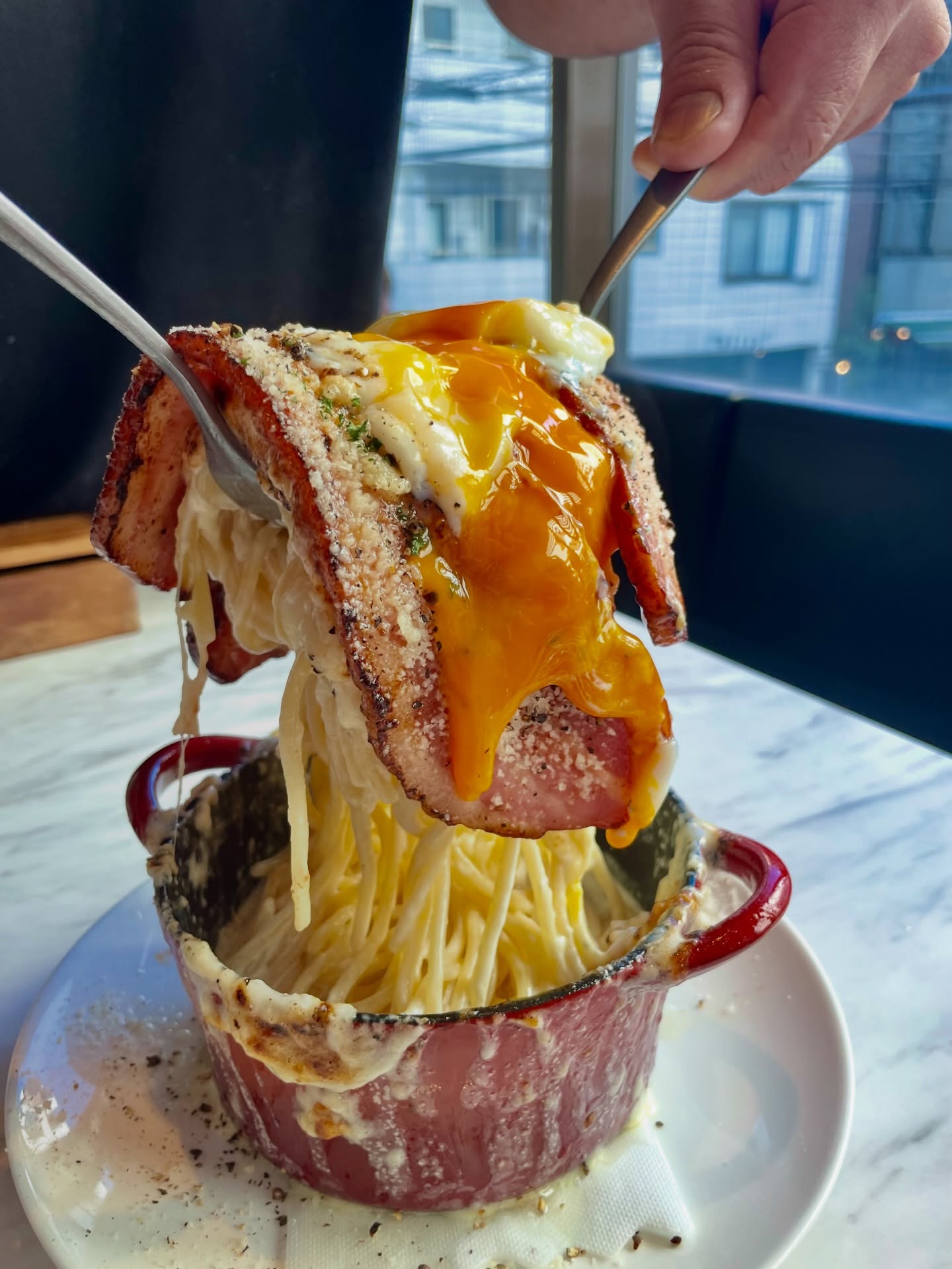 “カルボナーラボルケーノパスタ”がボリューム満点すぎる🧀