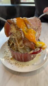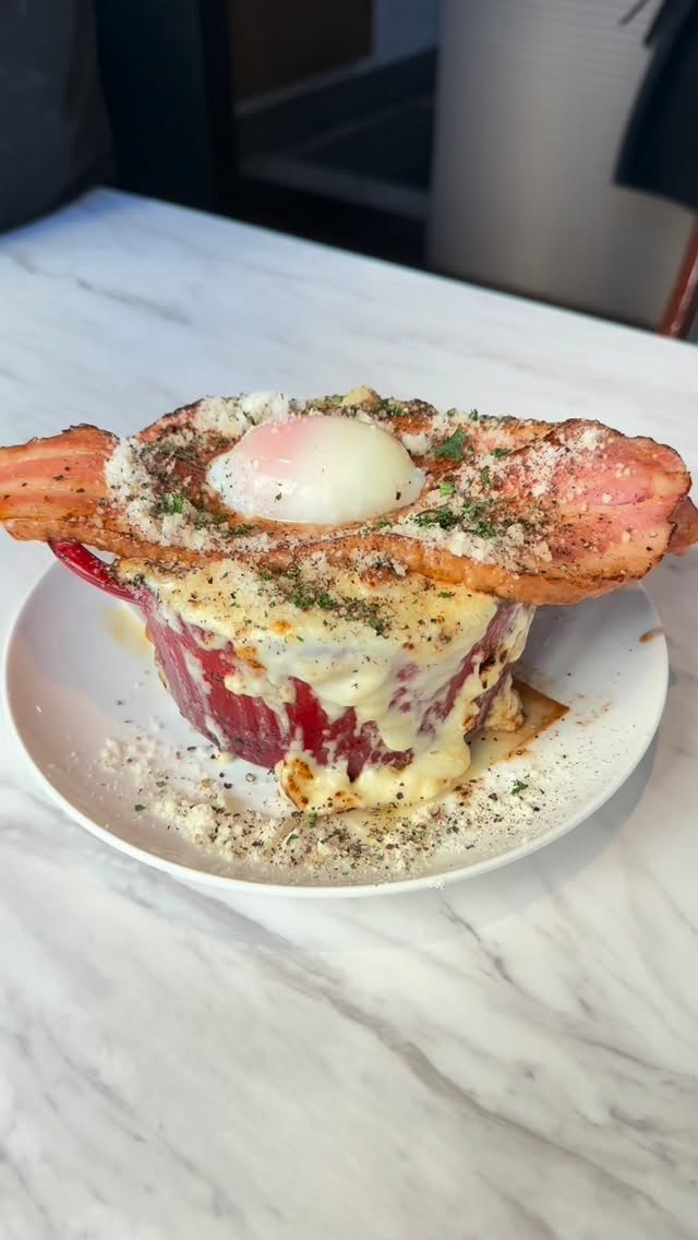 \チーズもソースも溢れ出す/ とろ〜り卵黄×濃厚チーズ×極厚ベーコンの最強トリオ!