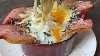 \チーズもソースも溢れ出す/ とろ〜り卵黄×濃厚チーズ×極厚ベーコンの最強トリオ!
