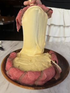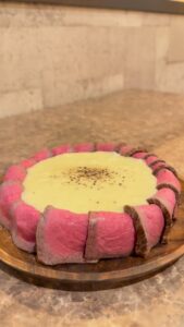 原価率70%をこえる、北海道産サーロイン肉のローストビーフをシカゴピザの周りにのせます。
