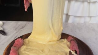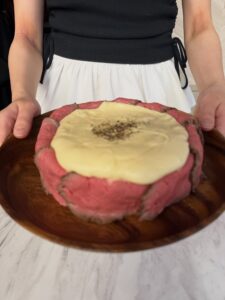 原価率70%をこえる、北海道産サーロイン肉のローストビーフをシカゴピザの周りにのせます。