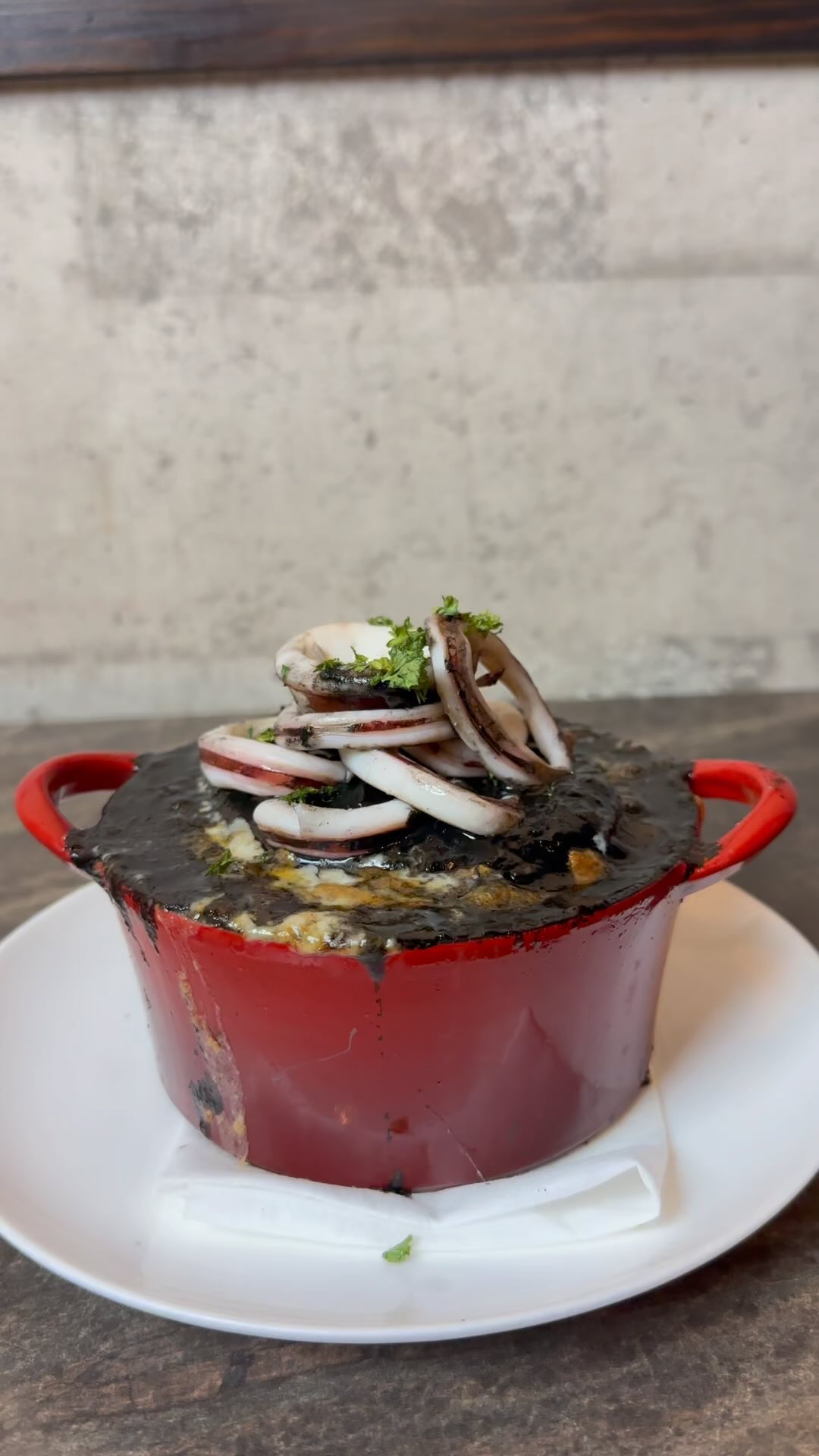 ゴロゴロいかに、イカスミソース、味はアラビアータ🌶️あとをひくうまさです!