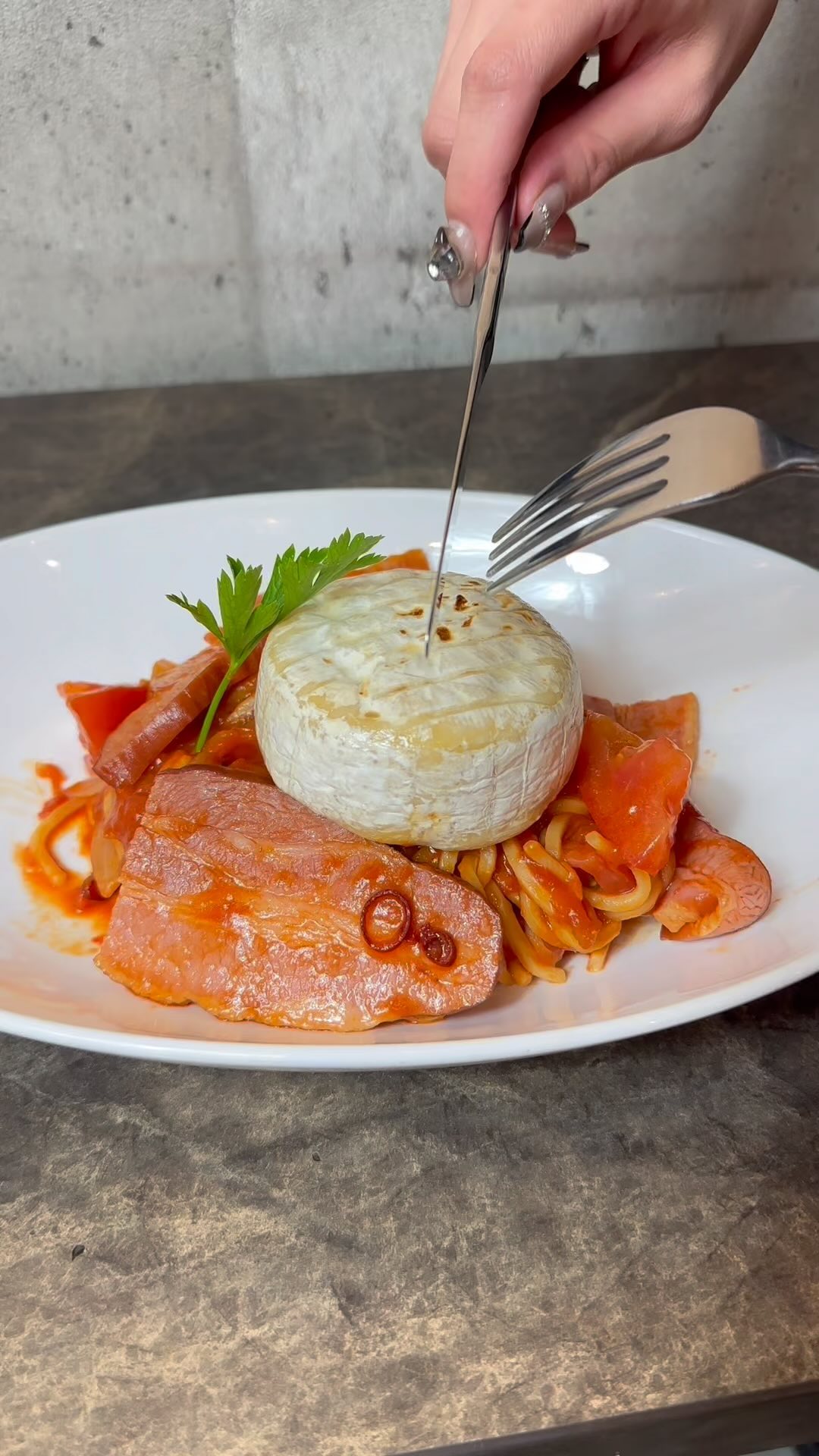 It’s luxuriously packed with a whole camembert! When you cut it, the melty cheese is irresistible 🧀 It’s great when eaten with pasta!